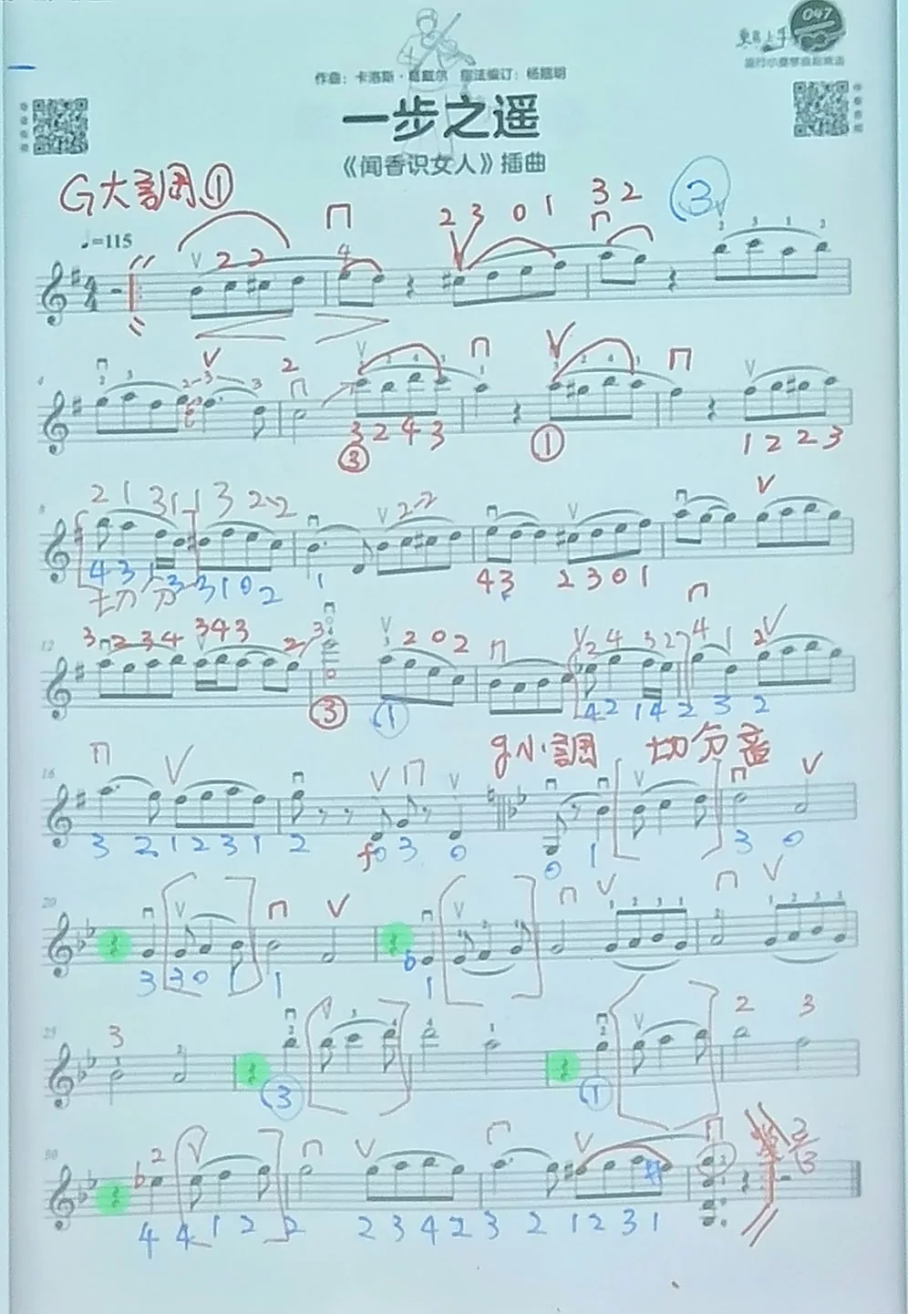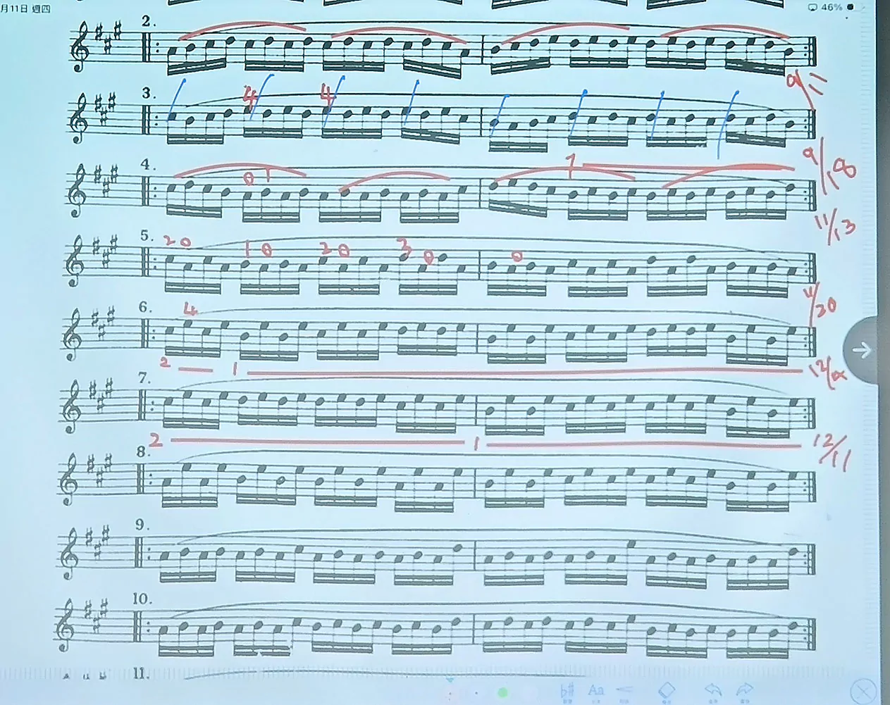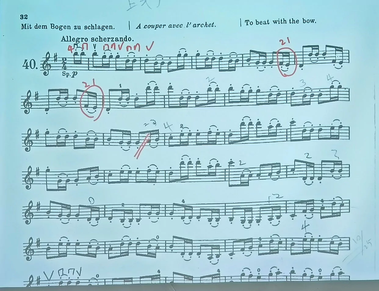 複習跳弓, 再練習拋弓(2個音一弓), 練習費華練習曲第40首1~7小節