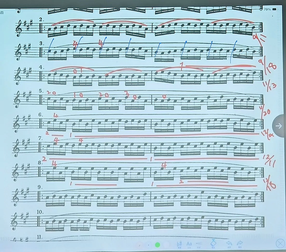 5. 手指練習 : 第7行 (4/8/16個音一弓), 第8行 (4/8/16個音一弓), 注意1及2指保留的地方